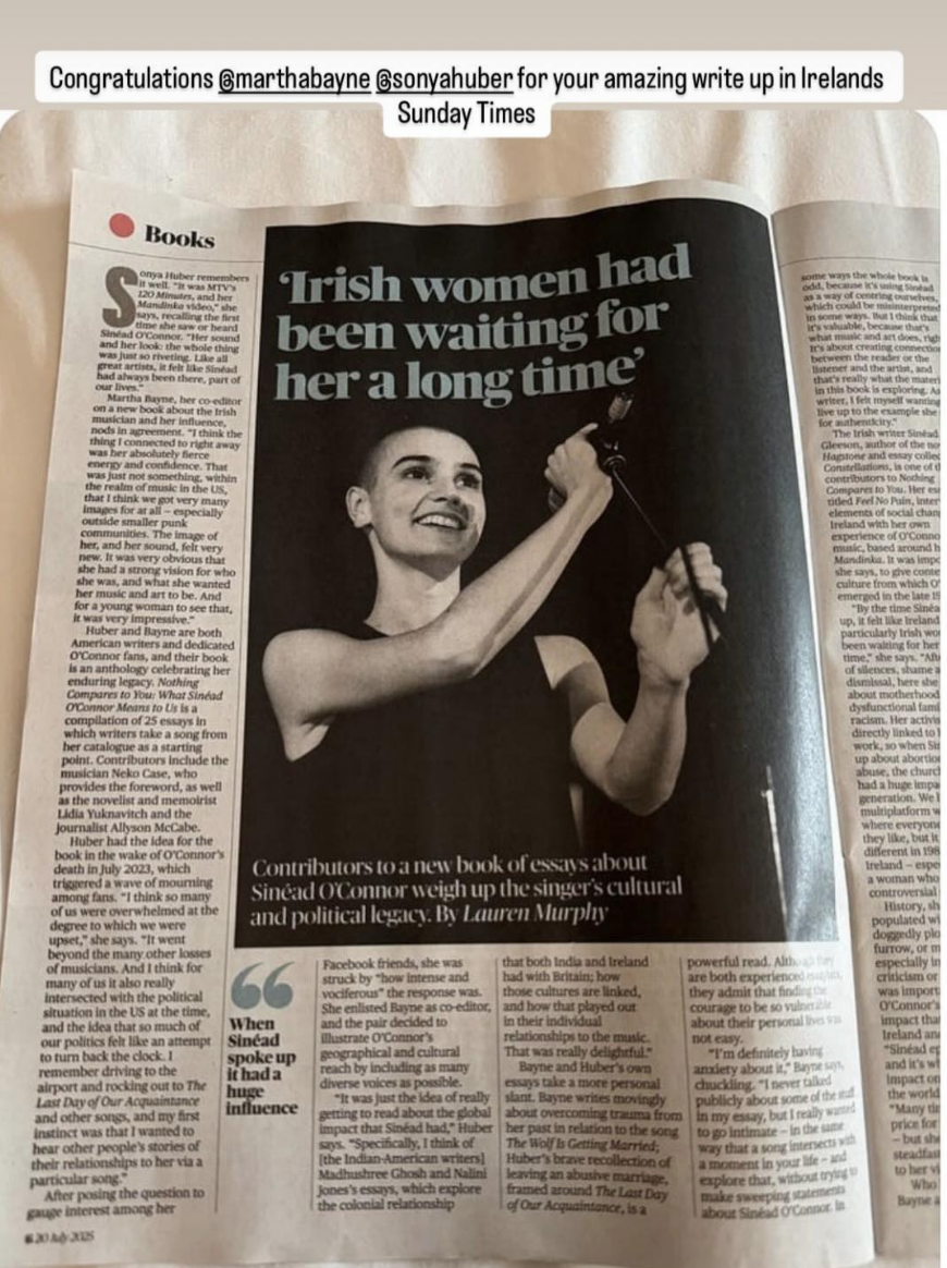 - July 28, 2025 Doors @ 6:30, Show @ 7:30: Chicago, IllinoisGMan Tavern: (Bar attached to Cabaret Metro) Book talk and party with Martha Bayne, Sonya Huber, Zoe Zolbrod, Megan Stielstra, and Gina Frangello -- plus musical performances of Sinead O'Connor songs by Amalea Tshilds, Marydee Reynolds, Jane Roberts, Nora O’Connor, Jeanine O’Toole, Eiren Caffall, Julie Pomerleau, and L. Wyatt. 3740 N Clark St. | Chicago, IL 60613