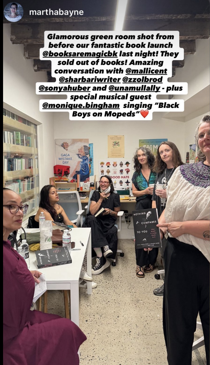 - July 22, 2025 @ 7 pm: New York, New YorkBooks Are Magic, 122 Montague St., Brooklyn, NY 11201. Launch event with Sharbari Ahmed, Martha Bayne, Sonya Huber, Porochista Khakpour, Millicent Souris, and Zoe Zolbrod, with musical guest Monique Bingham. And on YouTube live!