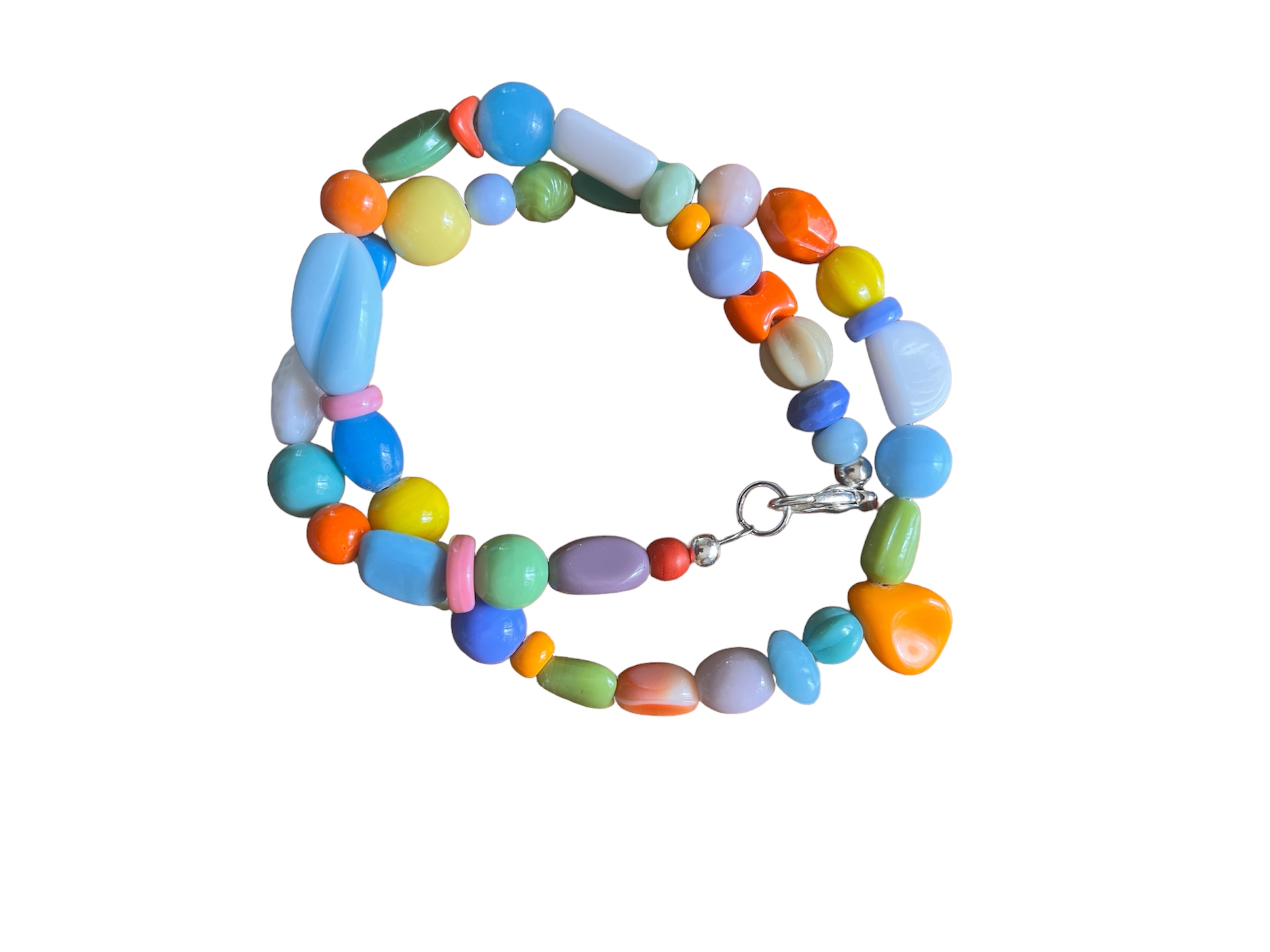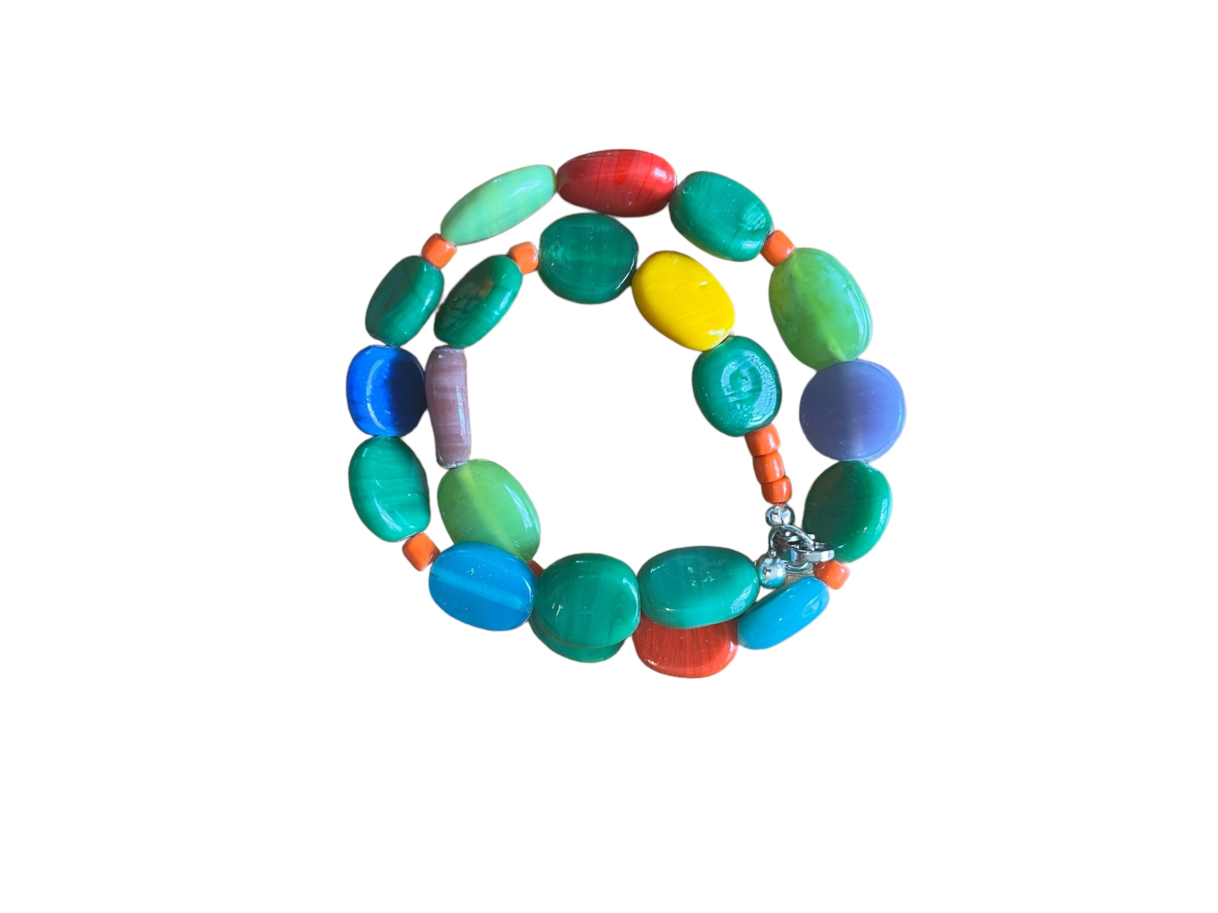 - Continuity of size, with broad and bright contrast in color and translucency, interspersed with rondelles for further continuity: The watchword here is BRIGHT COLORS and pleasing contrast, sort of a logic of maximum contrast at the single-bead level. This might be Voice First.