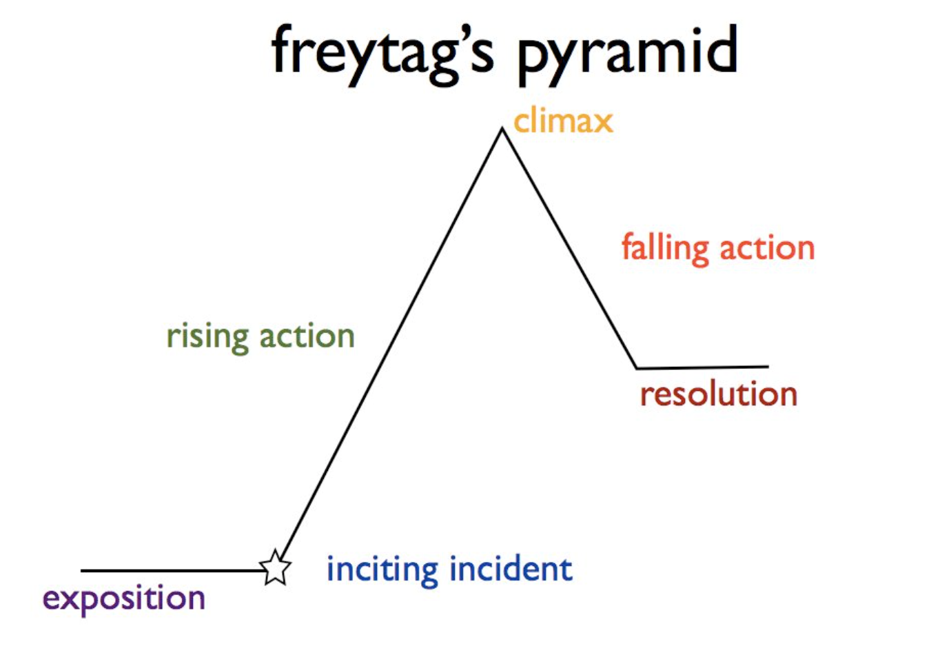 From this site: “Freytag’s Pyramid describes the five key stages of a story, offering a conceptual framework for writing a story from start to finish. These stages are: