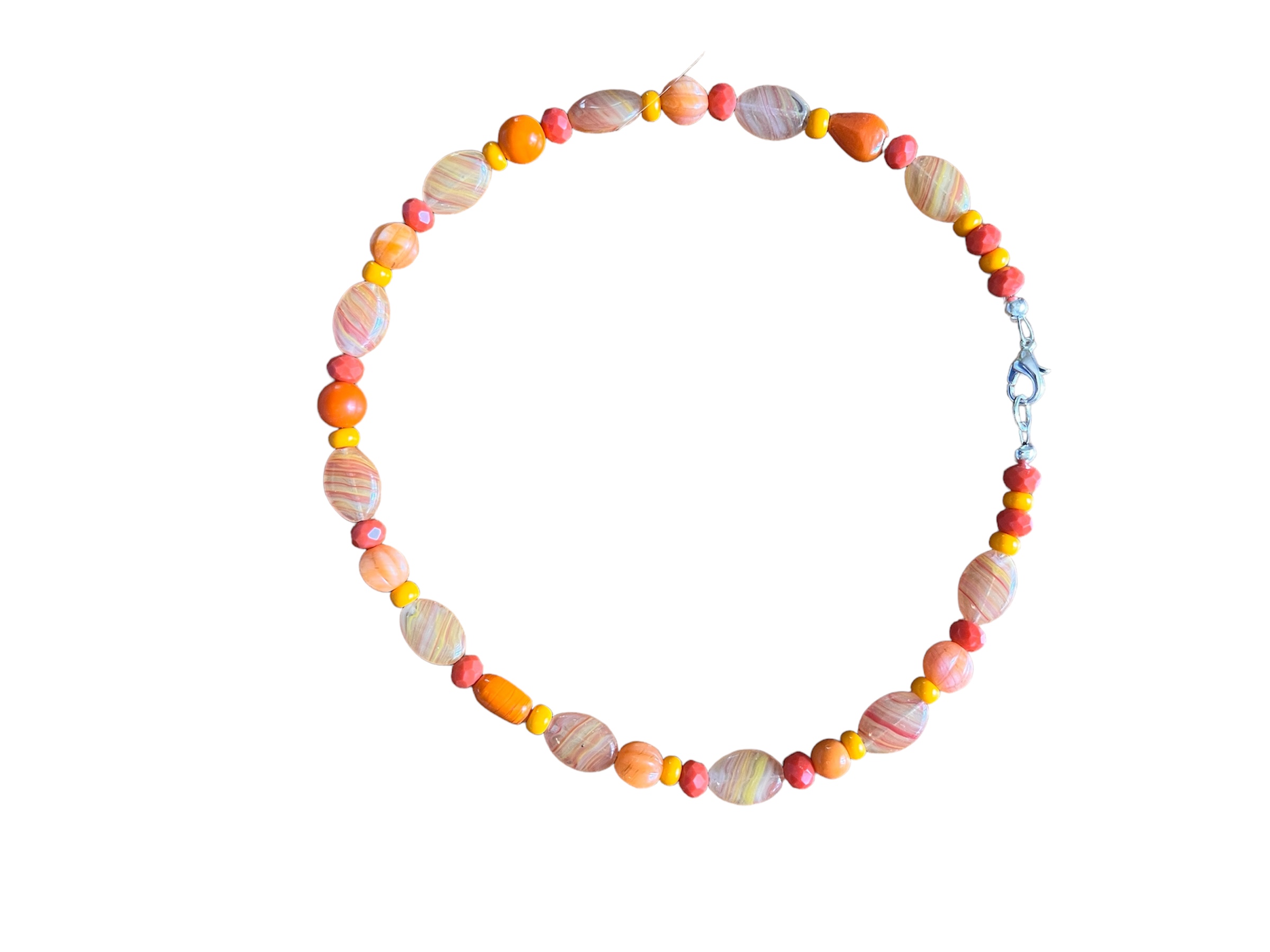 - Color Family, pattern in shape, size and translucency: This is a calm necklace in structure, to balance out the BRIGHT ORANGE of the color. This makes sense to me in terms of Supremely Tiny Acts: a weird idea enacted weirdly, balanced with consistency of style and voice so that it holds together: