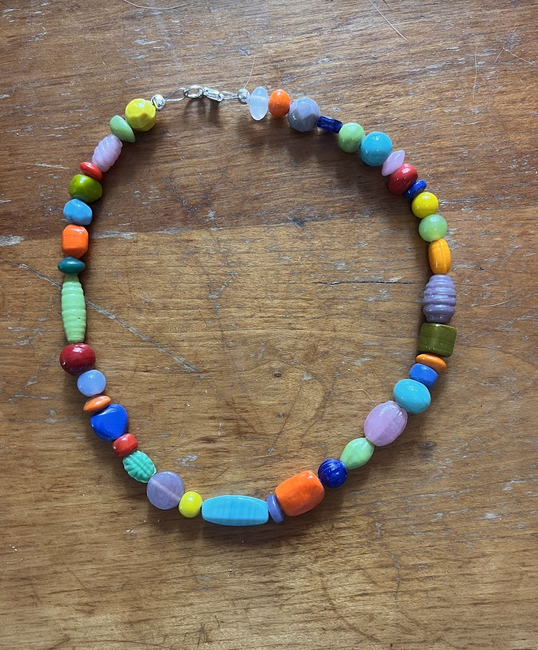 Now that I’m further along in writing, and now that I actually have money to buy beads, I have been thinking a lot about necklaces and how putting beads in patterns and rows is an intuitive process like structuring a manuscript. I sometimes have in my mind an overall mix of colors or a pattern of contrasts that might look cool, but I find that sitting down with beads and doing a rough draft on my bead board gets me closer to the specifics. When I’m playing with the beads, I notice juxtapositions and contrasts as well as minute differences in color in a different way than the general ideas in my head. This process feels similar to the structuring work of writing, because I can have an abstract structural idea for a section or paragraph, but then when I’m in the weeds of the sentences, I see that the piece of writing is slightly different than my idea of it, and that it offers different connections and leads to different places.