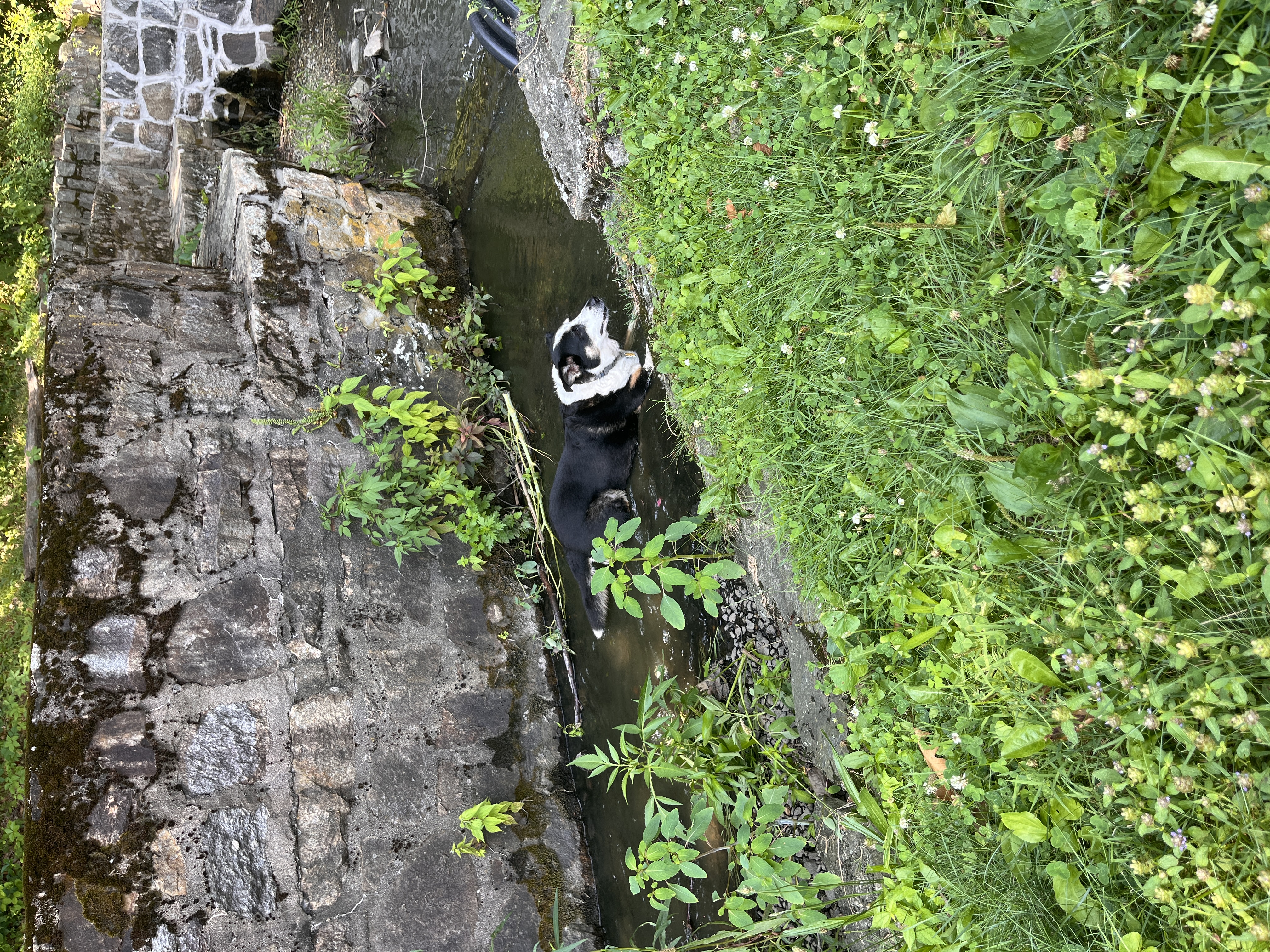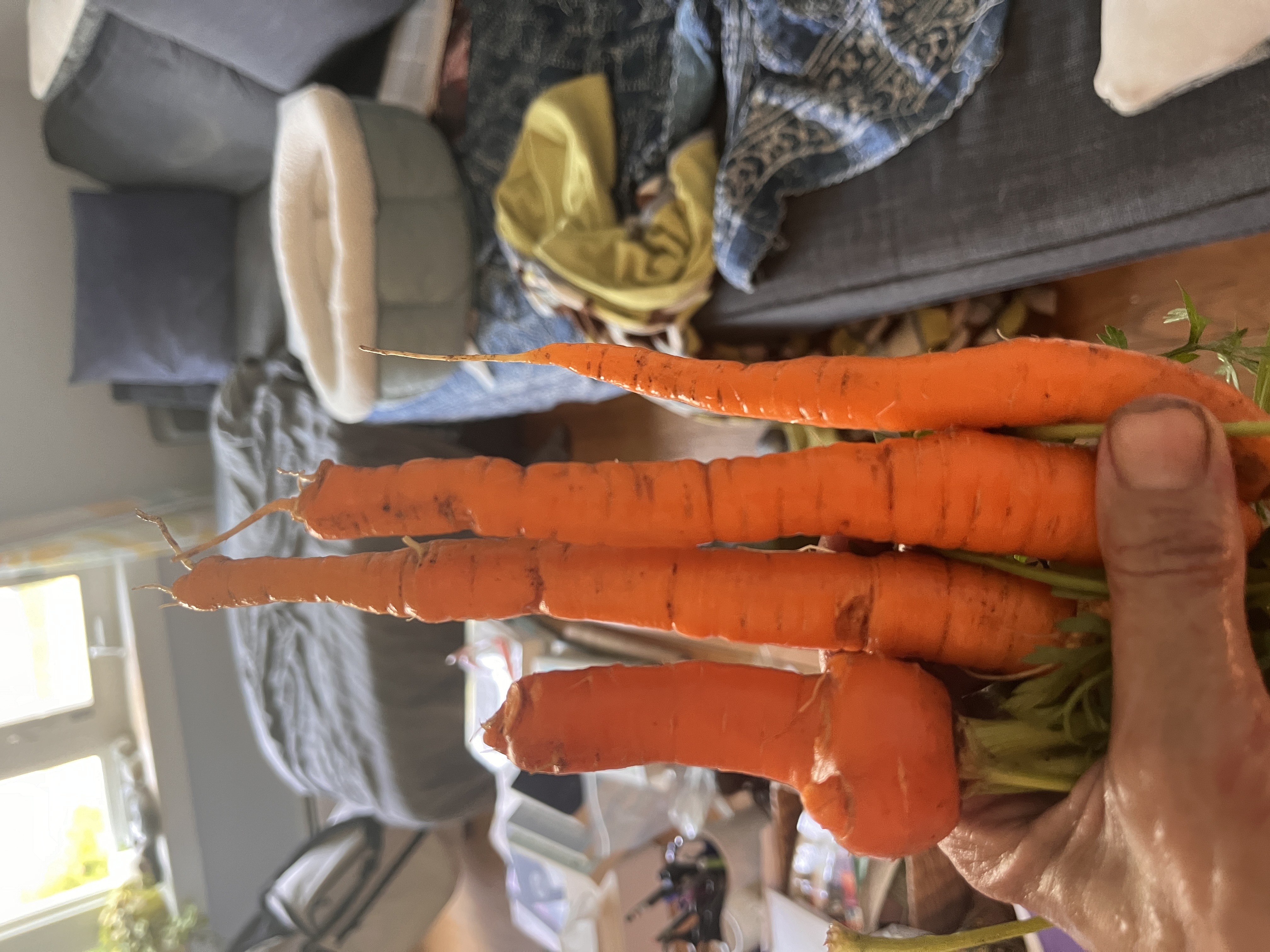 And here are pictures: the evening sky last night. A tiny little paint roller as part of a touch-up kit I used to fix after filling some holes. Carrots I picked two days ago. My dog sitting in a stream near my house. A contraption I built to ward off squirrels because I WANT CROW FRIENDS, DAMMIT, AND I’M GETTING SERIOUS ABOUT IT!